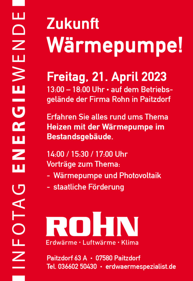 21. April 2023 13.00 – 18.00 Uhr – Infotag Zukunft Wärmepumpe 31 März 2023 Am 21. April 2023 in der Zeit von 13.00 - 18.-00 Uhr informieren wir zum Thema Wärmepumpe in Bestandsgebäude mit... siehe Details