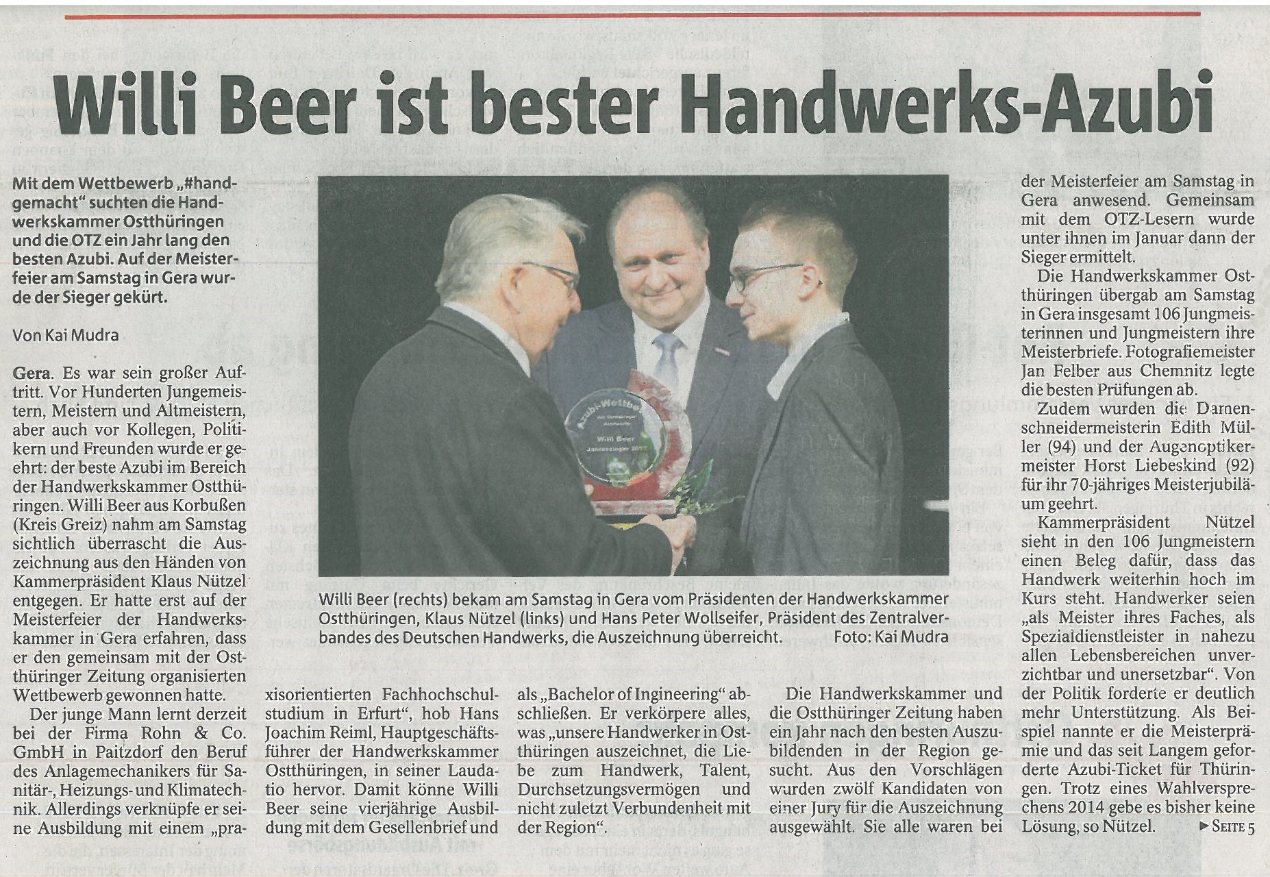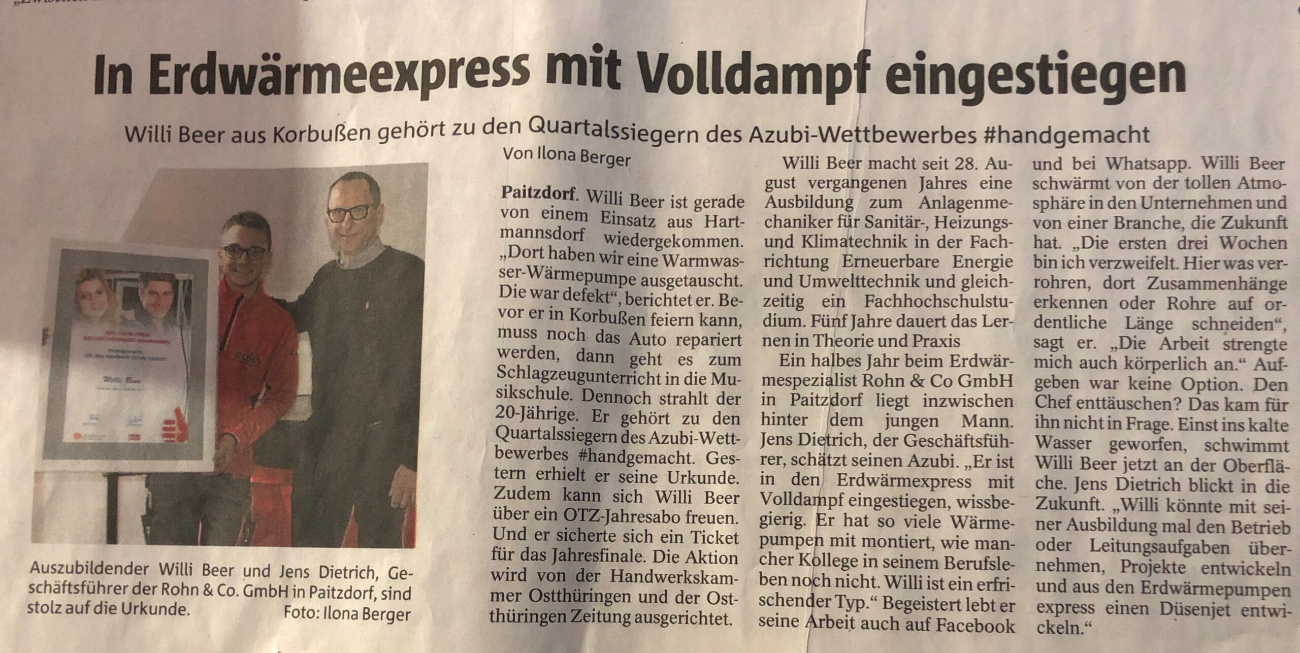 Unser Auszubildender Willi Beer wurde beim Azubi-Wettbewerb #handgemacht# der Ostthüringer Zeitung und der Handwerkskammer Ostthüringen aus 12 Kandidaten als Jahressieger ausgezeichnet. Er erlernt seit August 2017 in unserer Firma den Beruf des Anlagenmechanikers für Sanitär-, Heizungs- und Klimatechnik mit dem Schwerpunkt Umwelt in Verbindung mit einem Fachhochschulstudium als „Bachelor of Ingeneering“.