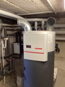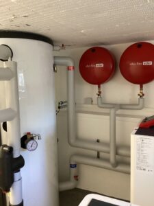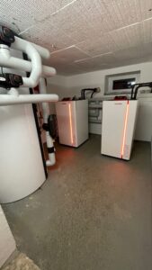 Die alte Ölheizung wurde demontiert und fachgerecht entsorgt. Die Gebäude werden mittels Heizkörpern und teilweise Fußbodenheizung beheizt. Das aus zwei Wohngebäuden bestehende Anwesen wird nun mit 2 Stück Luft/Wasser-Wärmepumpen Typ OCHSNER AIR 18 C11A und OCHSNER AIR 11 C11A in Kaskadenbauweise beheizt. Die Warmwasserbereitung erfolgt in beiden Gebäude separat mit je einer Warmwasser-Wärmepumpe Typ OCHSNER EUROPA 250DK. Die neue Heizungsanlage ist verknüpft zu einem ROHN-Heimkraftwerk mit der noch zu errichtenden Photovoltaikanlage.