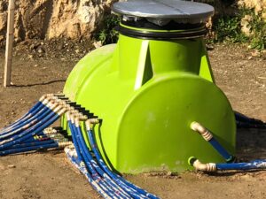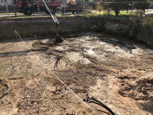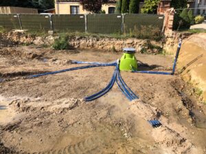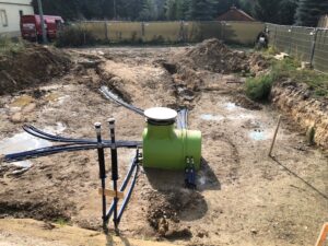 Verrohrung von 6 Stück Erdwärmesonden in Kistritz bei Teuchern. Diese Erdwärmesonden versorgen 2 Stück OCHSNER Sole/Wasser-Wärmepumpen, mit denen zwei Gebäude beheizt und gekühlt werden. Die Erdwärmesonden wurden unter dem neu entstehenden Betriebsgebäude gebohrt, nun beginnt der Hochbau.