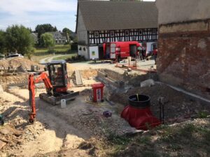 Verrohrung Erdwärmesonden in 07580 Vogelgesang. Bauherren entschieden sich für die Variante mit dem Weinkeller. Zwei Erdwärmesonden wurden unter das entstehende Einfamilienhaus gebohrt. In diesem Kühlschrank ohne Strom finden alle Getränke und Lebensmittel Platz, die gekühlt werden müssen. Im Erdreich unter dem Hause herrschen dann ständig 8-10° Celsius.